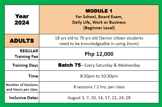 GO PREMIUM and Worry No More! We will be sending you a private recorded video link of all our classes for a small additional fee of only Php 3,000 pesos for the whole 8 sessions, and receive NON-EXPIRING private video links of your batch that you can pause, review, and continue to replay endlessly. So, no need to re-enroll for a refresher program in case the student wants to review the lessons. (Quick note: Our lessons are copyrighted and for the personal use of the enrolled student only).