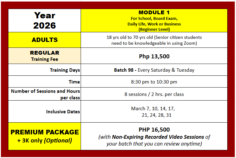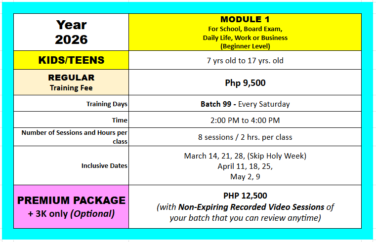 GO PREMIUM and Worry No More! We will be sending you a private recorded video link of all our classes for a small additional fee of only Php 3,000 pesos for the whole 8 sessions, and receive NON-EXPIRING private video links of your batch that you can pause, review, and continue to replay endlessly. So, no need to re-enroll for a refresher program in case the student wants to review the lessons. (Quick note: Our lessons are copyrighted and for the personal use of the enrolled student only).