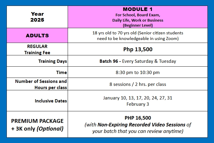 GO PREMIUM and Worry No More! We will be sending you a private recorded video link of all our classes for a small additional fee of only Php 3,000 pesos for the whole 8 sessions, and receive NON-EXPIRING private video links of your batch that you can pause, review, and continue to replay endlessly. So, no need to re-enroll for a refresher program in case the student wants to review the lessons. (Quick note: Our lessons are copyrighted and for the personal use of the enrolled student only).