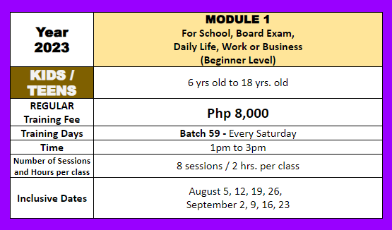 GO PREMIUM and Worry No More! We will be sending you a private recorded video link of all our classes for an additional fee of only Php 3,000 pesos for the whole 8 sessions, and receive NON-EXPIRING private video links of your batch that you can pause, review, and continue to replay endlessly. So, no need to re-enroll for a refresher program in case the student wants to review the lessons. (Quick note: Our lessons are copyrighted and for the personal use of the enrolled student only).