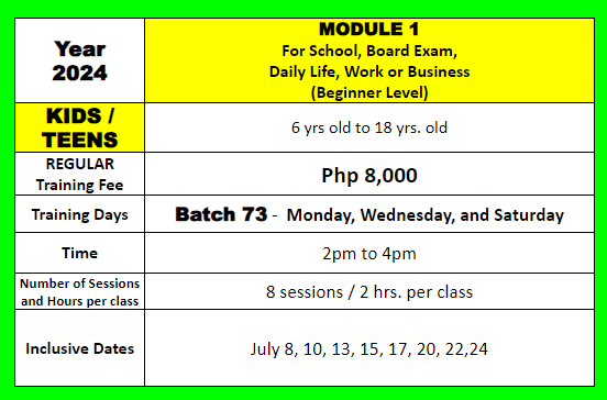 GO PREMIUM and Worry No More! We will be sending you a private recorded video link of all our classes for a small additional fee of only Php 3,000 pesos for the whole 8 sessions, and receive NON-EXPIRING private video links of your batch that you can pause, review, and continue to replay endlessly. So, no need to re-enroll for a refresher program in case the student wants to review the lessons. (Quick note: Our lessons are copyrighted and for the personal use of the enrolled student only).