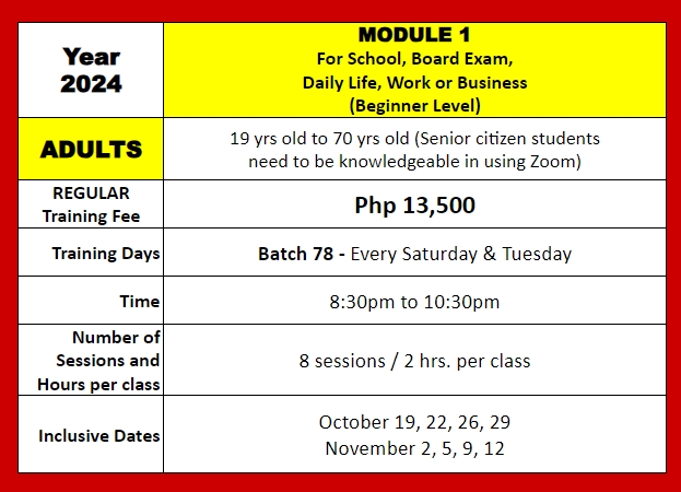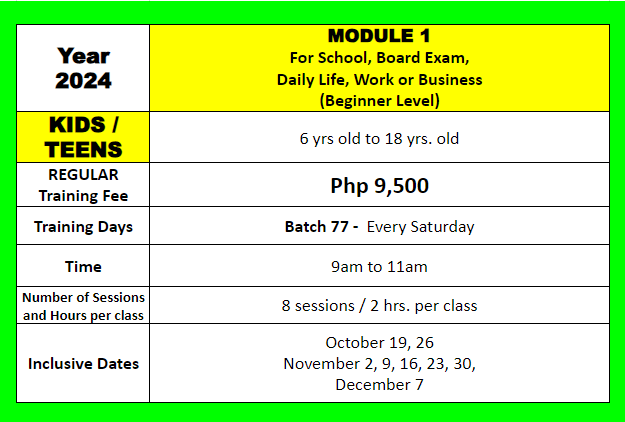 GO PREMIUM and Worry No More! We will be sending you a private recorded video link of all our classes for a small additional fee of only Php 3,000 pesos for the whole 8 sessions, and receive NON-EXPIRING private video links of your batch that you can pause, review, and continue to replay endlessly. So, no need to re-enroll for a refresher program in case the student wants to review the lessons. (Quick note: Our lessons are copyrighted and for the personal use of the enrolled student only).